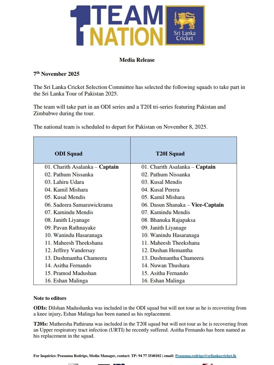 ජාතික කණ්ඩායම 2025 නොවැම්බර් 8 වන දින පකිස්ථානය බලා පිටත්ව යාමට නියමිතය.